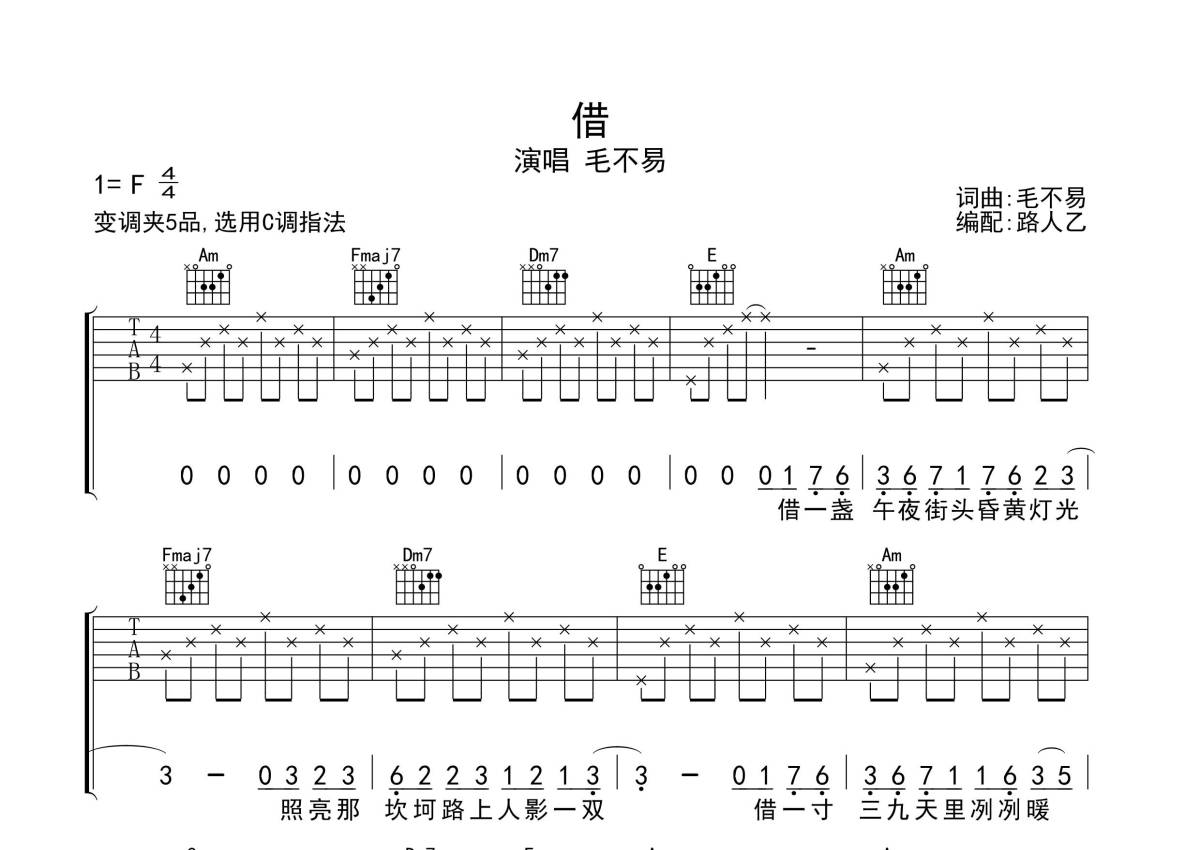 毛不易《借》吉他谱 - C调弹唱六线谱
