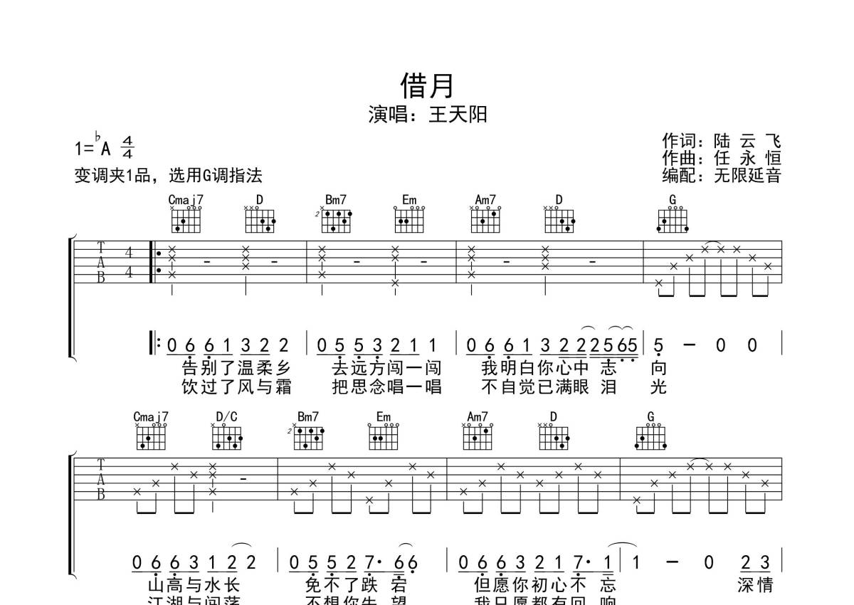 王天阳《借月》吉他谱 - G调弹唱六线谱