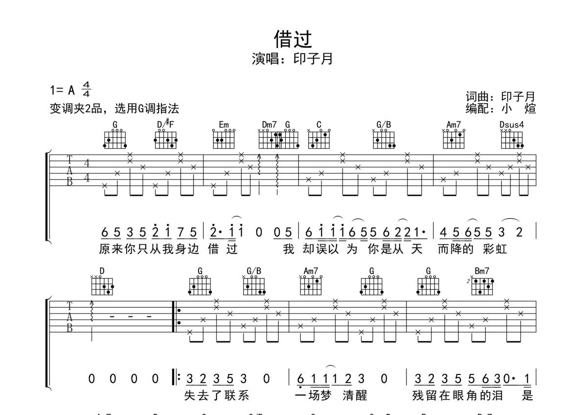 《借过》是印子月演唱的一首歌曲,拍号为4/4拍,歌曲原调为A调,但由于原调指法比较难,为了方便弹奏,本吉他谱采用的是G调指法编配,变调夹2品弹奏即为原调,当然也可以根据自己的音域改变变调夹位置,或者通过改变和弦调性,以方便自己弹奏,这份吉他谱共有三张高清图谱,图谱由 @无限延音 编配上传,图谱使用六线谱编配,包含吉他和弦指法、简谱以及歌词部分,使用这份借过吉他谱,可以让你更加方便地掌握这首歌曲的弹唱技巧,快来尝试吧。