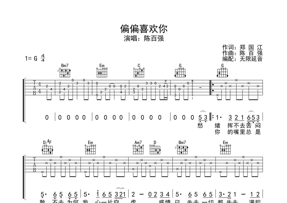 陈百强《偏偏喜欢你》吉他谱 - G调弹唱六线谱