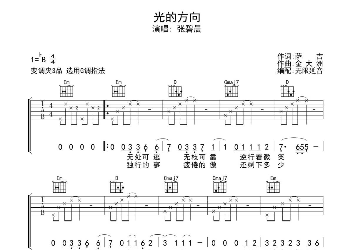 《光的方向》是张碧晨演唱的一首歌曲,拍号为4/4拍,歌曲原调为Bb调,但由于原调指法比较难,为了方便弹奏,本吉他谱采用的是G调指法编配,变调夹3品弹奏即为原调,当然也可以根据自己的音域改变变调夹位置,或者通过改变和弦调性,以方便自己弹奏,这份吉他谱共有两张高清图谱,图谱由 @无限延音 编配上传,图谱使用六线谱编配,包含吉他和弦指法、简谱以及歌词部分,使用这份光的方向吉他谱,可以让你更加方便地掌握这首歌曲的弹唱技巧,快来尝试吧。