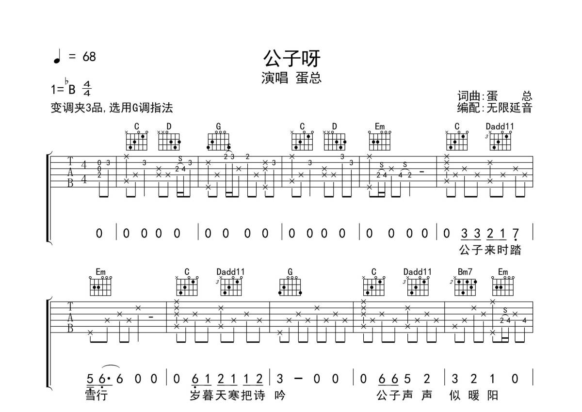 蛋总《公子呀》吉他谱 - G调弹唱六线谱