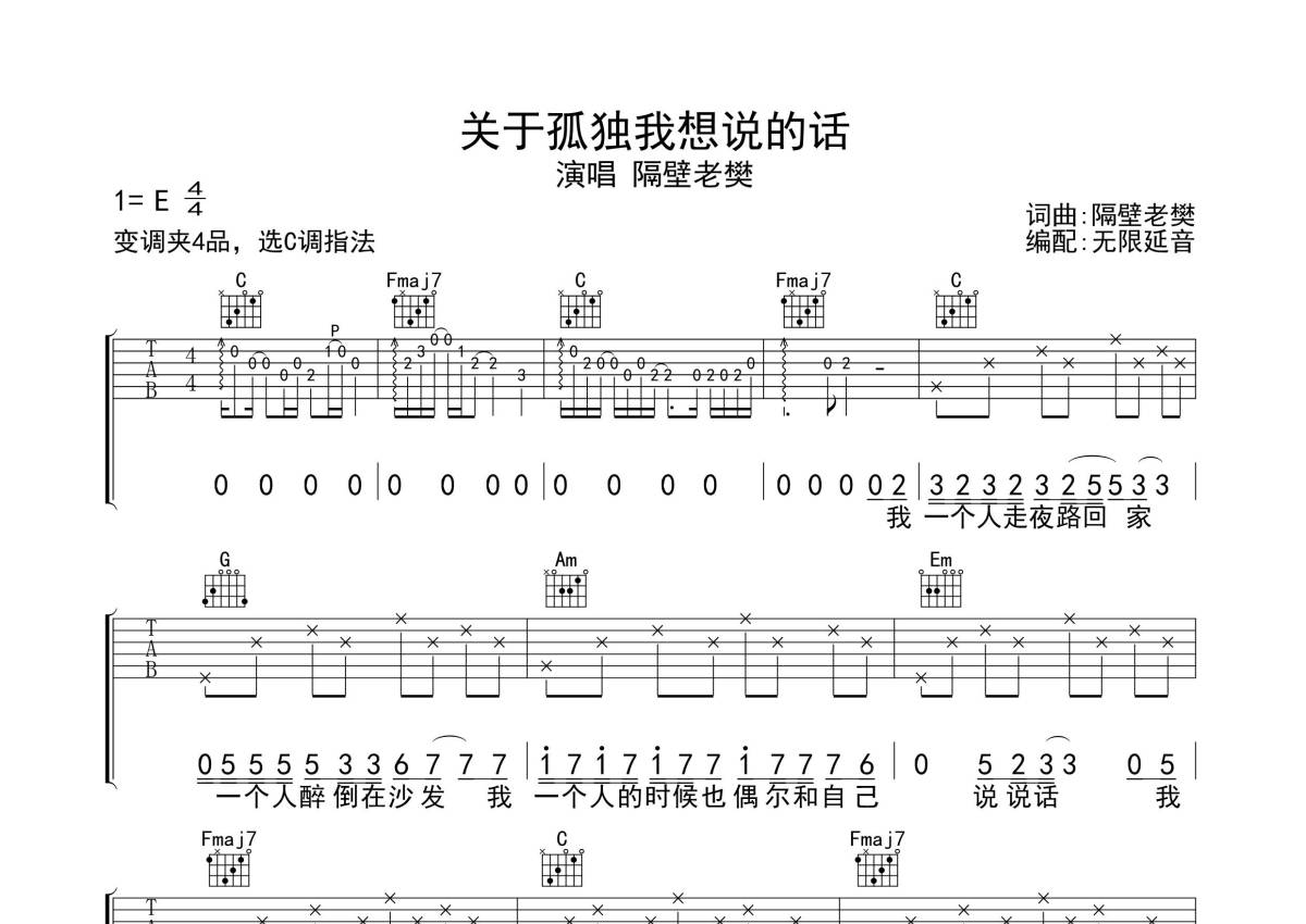 隔壁老樊《关于孤独我想说的话》吉他谱 - C调弹唱六线谱