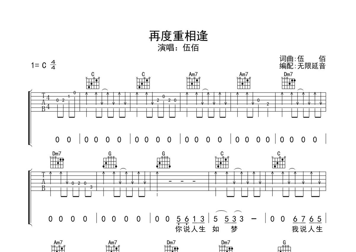 伍佰《再度重相逢》吉他谱 - C调弹唱六线谱