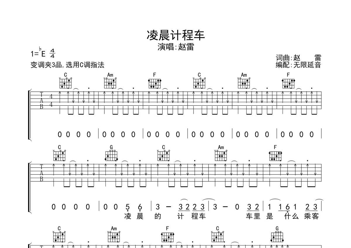 《凌晨计程车》是赵雷演唱的一首歌曲,拍号为4/4拍,歌曲原调为Eb调,但由于原调指法比较难,为了方便弹奏,本吉他谱采用的是C调指法编配,变调夹3品弹奏即为原调,当然也可以根据自己的音域改变变调夹位置,或者通过改变和弦调性,以方便自己弹奏,这份吉他谱共有三张高清图谱,图谱由 @无限延音 编配上传,图谱使用六线谱编配,包含吉他和弦指法、简谱以及歌词部分,使用这份凌晨计程车吉他谱,可以让你更加方便地掌握这首歌曲的弹唱技巧,快来尝试吧。