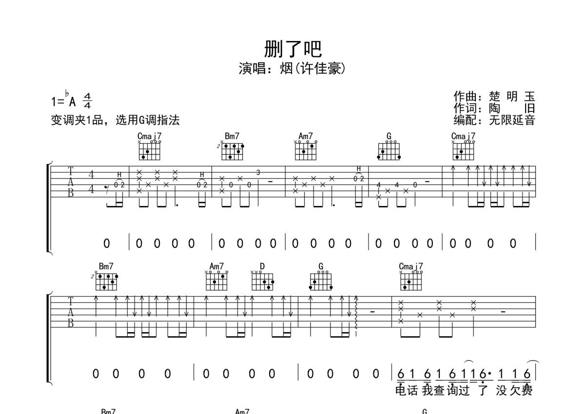 许佳豪《删了吧》吉他谱 - G调弹唱六线谱