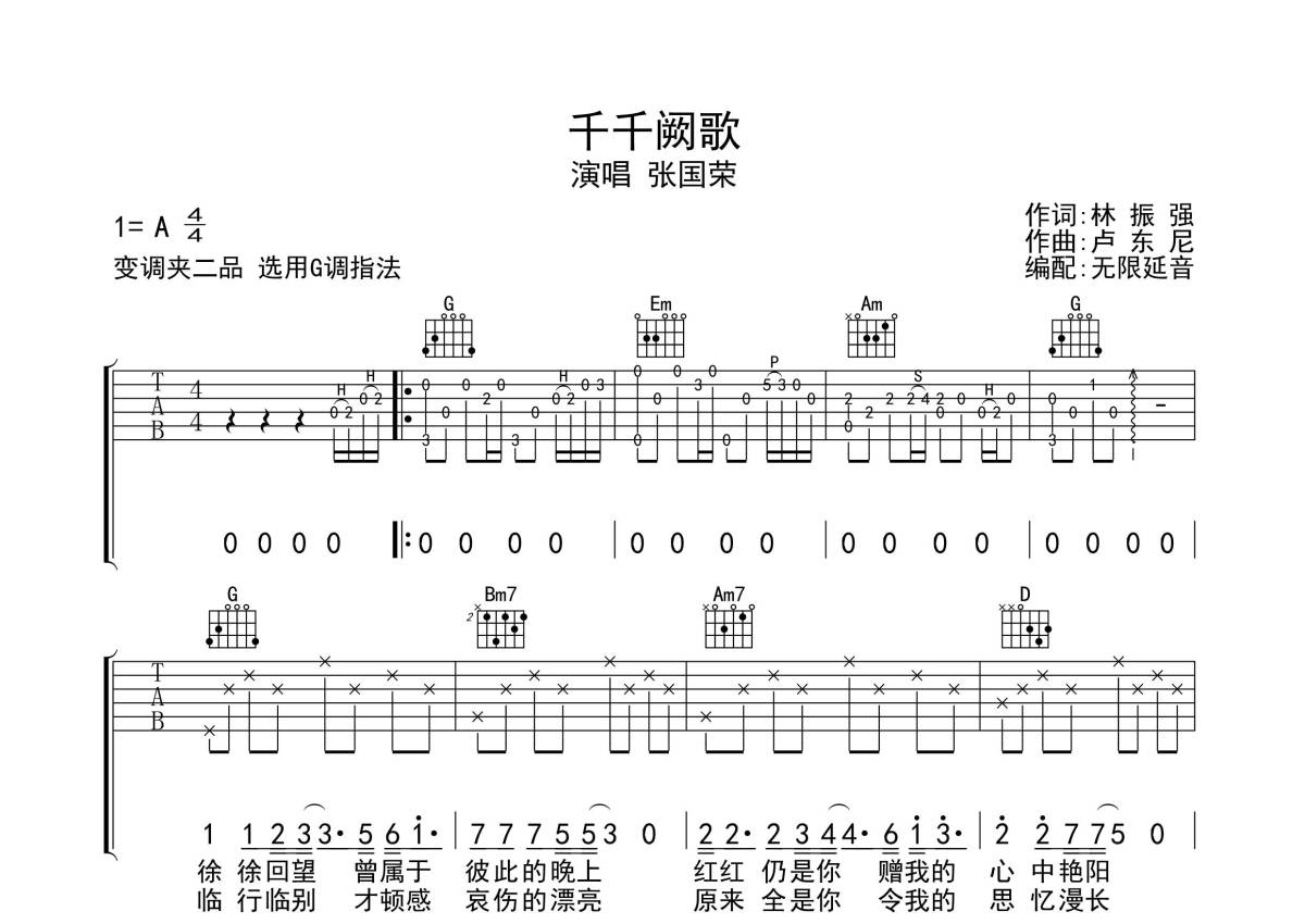 张国荣《千千阙歌》吉他谱 - G调弹唱六线谱