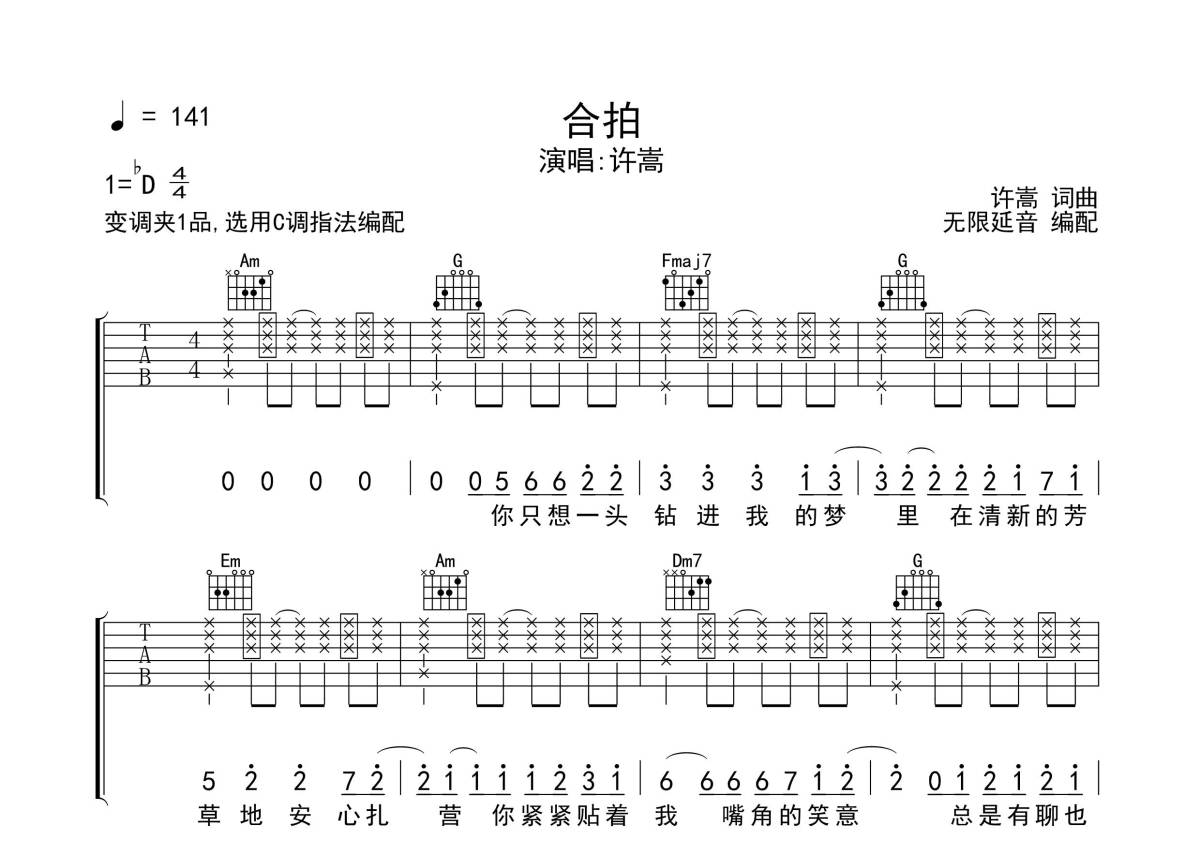 《合拍》是许嵩演唱的一首歌曲,拍号为4/4拍,歌曲速度为每分钟141拍,歌曲原调为Db调,但由于原调指法比较难,为了方便弹奏,本吉他谱采用的是C调指法编配,变调夹1品弹奏即为原调,当然也可以根据自己的音域改变变调夹位置,或者通过改变和弦调性,以方便自己弹奏,这份吉他谱共有三张高清图谱,图谱由 @无限延音 编配上传,图谱使用六线谱编配,包含吉他和弦指法、简谱以及歌词部分,使用这份合拍吉他谱,可以让你更加方便地掌握这首歌曲的弹唱技巧,快来尝试吧。