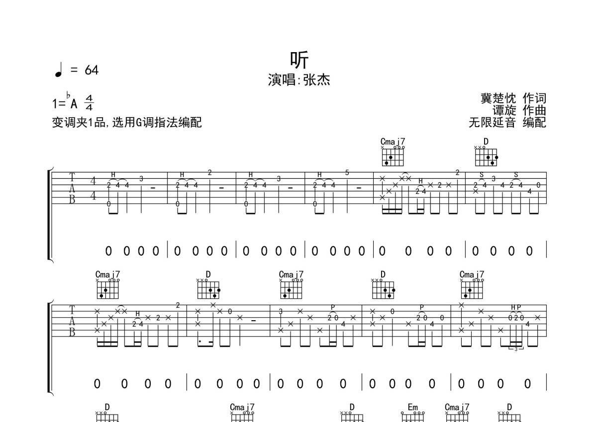 《听》是张杰演唱的一首歌曲,拍号为4/4拍,歌曲速度为每分钟64拍,歌曲原调为Ab调,但由于原调指法比较难,为了方便弹奏,本吉他谱采用的是G调指法编配,变调夹1品弹奏即为原调,当然也可以根据自己的音域改变变调夹位置,或者通过改变和弦调性,以方便自己弹奏,这份吉他谱共有三张高清图谱,图谱由 @无限延音 编配上传,图谱使用六线谱编配,包含吉他和弦指法、简谱以及歌词部分,使用这份听吉他谱,可以让你更加方便地掌握这首歌曲的弹唱技巧,快来尝试吧。