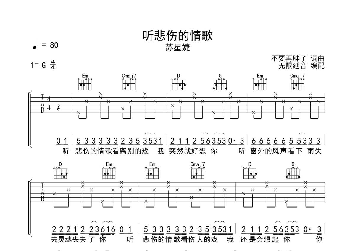 《听悲伤的情歌》是苏星婕演唱的一首歌曲,拍号为4/4拍,歌曲速度为每分钟80拍,歌曲原调为G调,本吉他谱采用的是G调指法编配,演奏时不需要使用变调夹即为原调,这份吉他谱共有三张高清图谱,图谱由 @无限延音 编配上传,图谱使用六线谱编配,包含吉他和弦指法、简谱以及歌词部分,使用这份听悲伤的情歌吉他谱,可以让你更加方便地掌握这首歌曲的弹唱技巧,快来尝试吧。