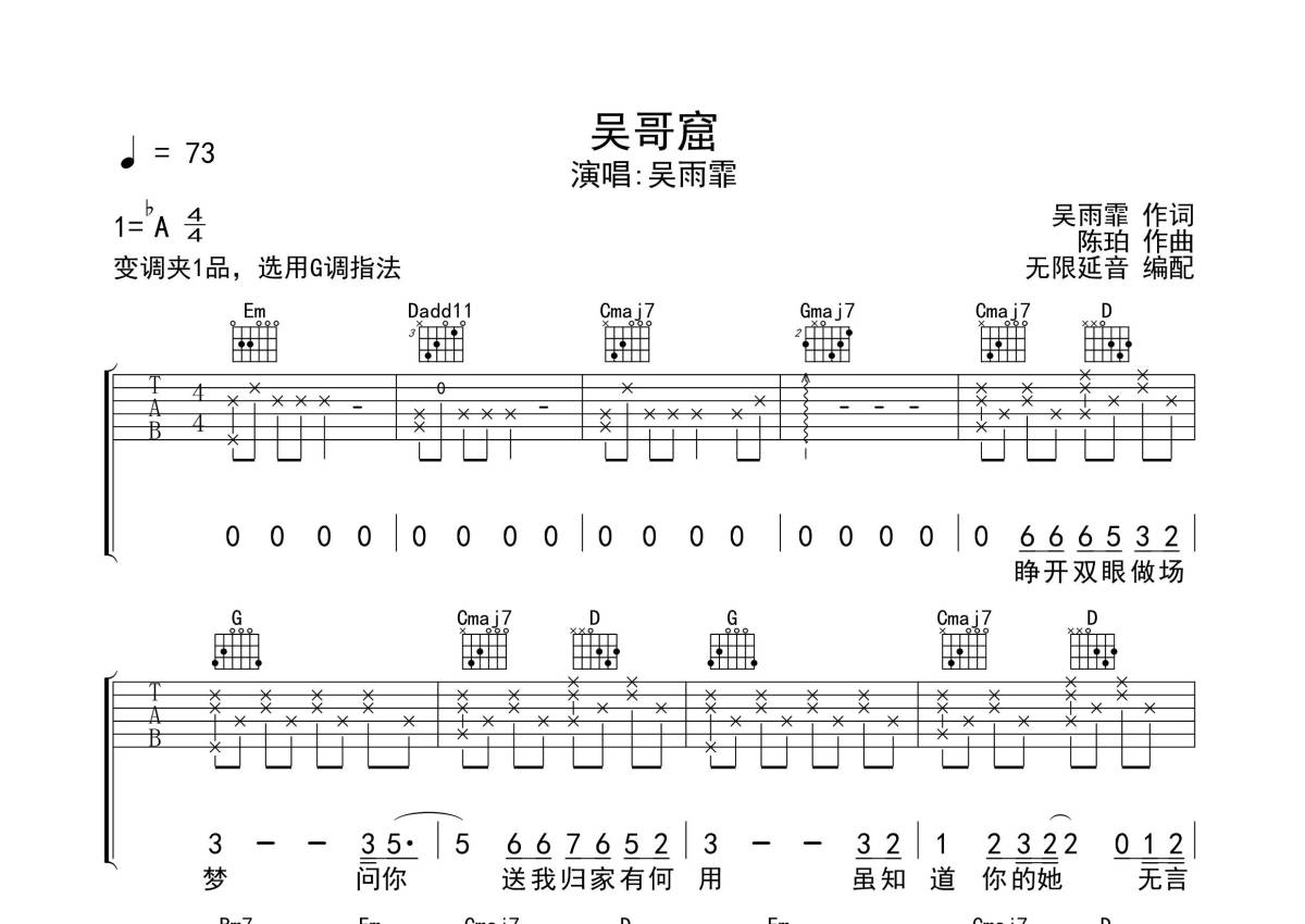 《吴哥窟》是吴雨霏演唱的一首歌曲,拍号为4/4拍,歌曲速度为每分钟73拍,歌曲原调为Ab调,但由于原调指法比较难,为了方便弹奏,本吉他谱采用的是C调指法编配,变调夹1品弹奏即为原调,当然也可以根据自己的音域改变变调夹位置,或者通过改变和弦调性,以方便自己弹奏,这份吉他谱共有三张高清图谱,图谱由 @无限延音 编配上传,图谱使用六线谱编配,包含吉他和弦指法、简谱以及歌词部分,使用这份吴哥窟吉他谱,可以让你更加方便地掌握这首歌曲的弹唱技巧,快来尝试吧。