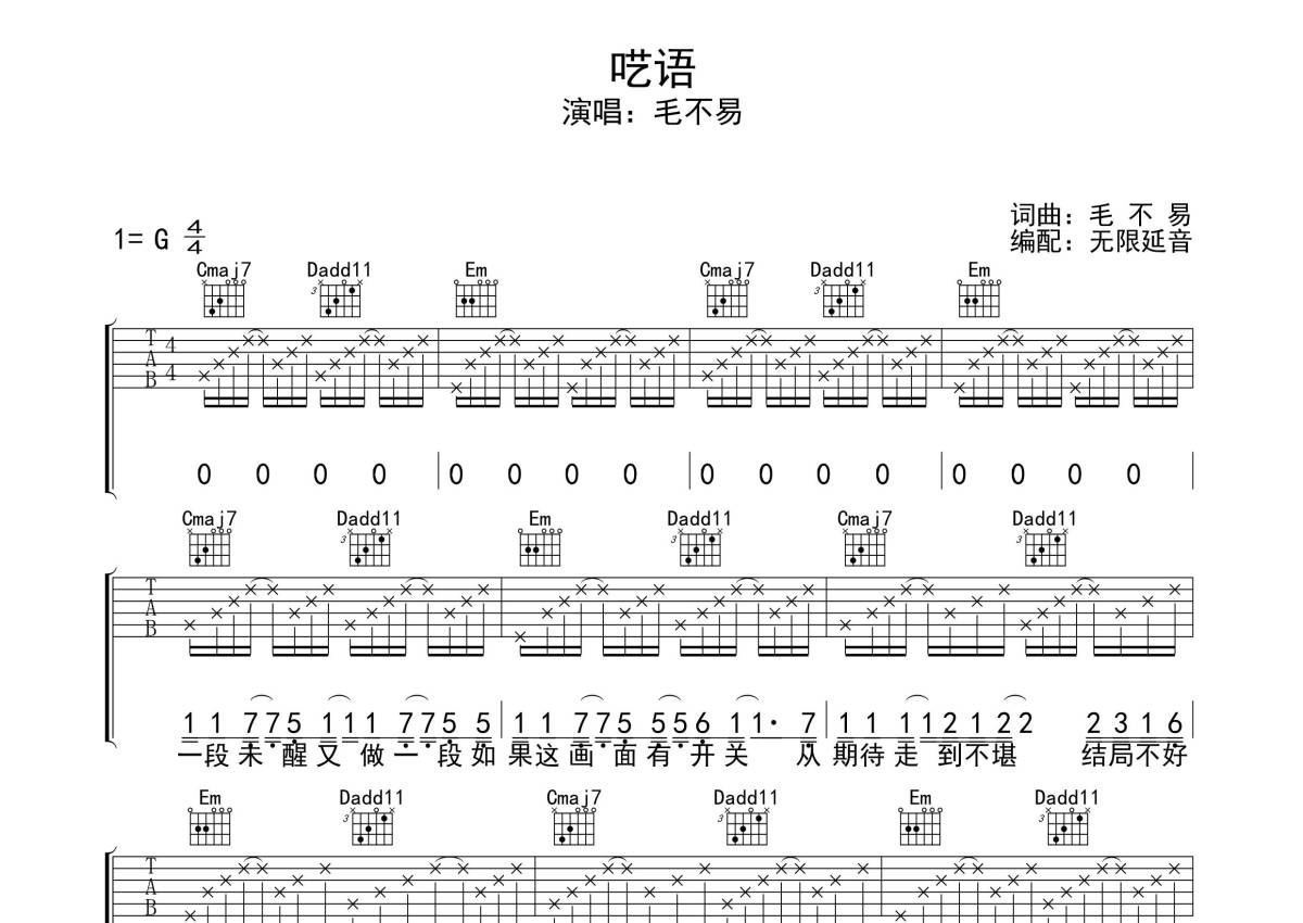 毛不易《呓语》吉他谱 - G调弹唱六线谱