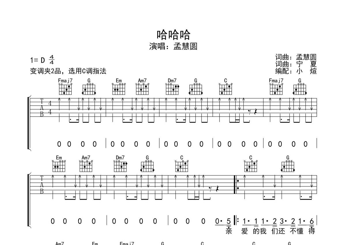 孟慧圆《哈哈哈》吉他谱 - C调弹唱六线谱