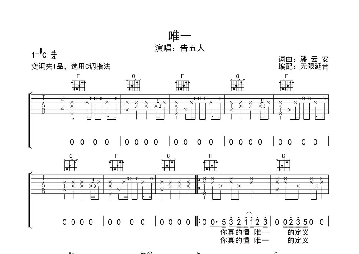 告五人《唯一》吉他谱 - C调弹唱六线谱