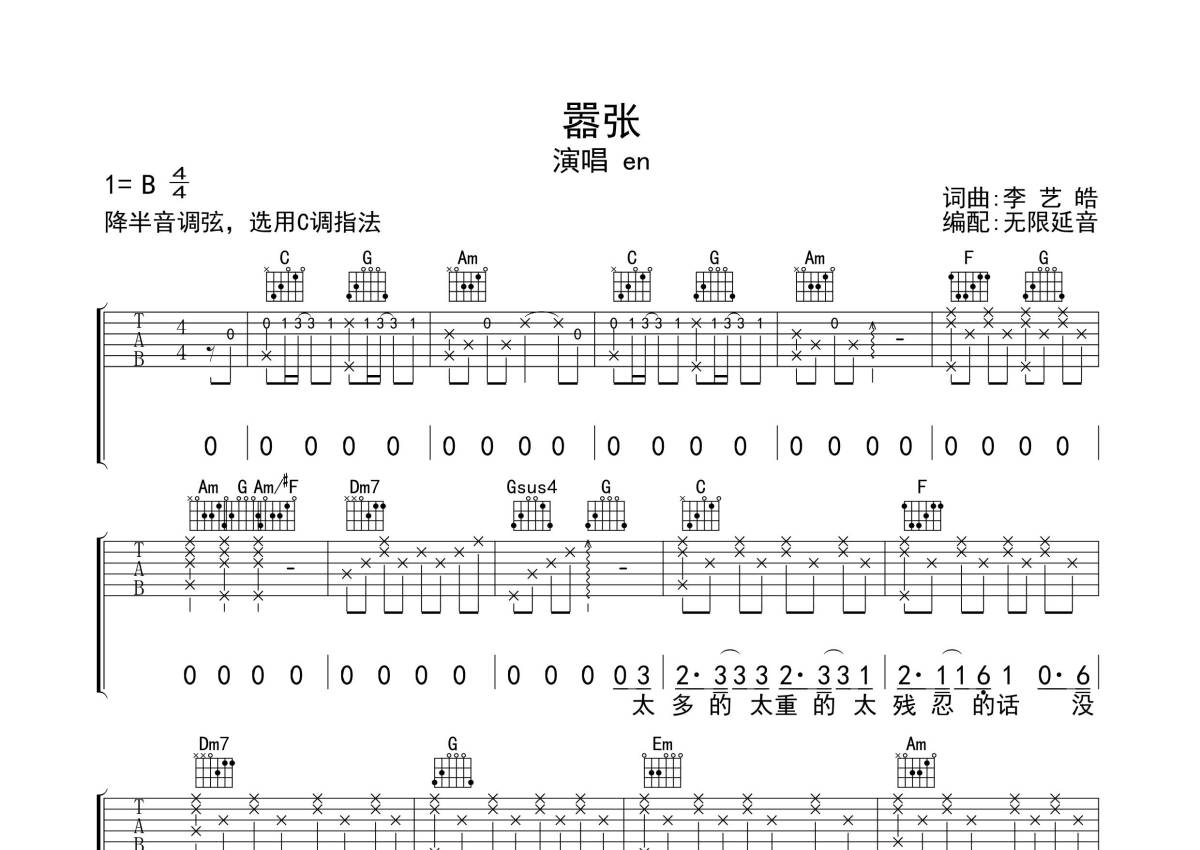 《嚣张》是en演唱的一首歌曲,拍号为4/4拍,歌曲原调为B调,但由于原调指法比较难,为了方便弹奏,本吉他谱采用的是C调指法编配,降半音调弦弹奏即为原调,当然也可以根据自己的音域决定是否调弦,这份吉他谱共有两张高清图谱,图谱由 @无限延音 编配上传,图谱使用六线谱编配,包含吉他和弦指法、简谱以及歌词部分,使用这份嚣张吉他谱,可以让你更加方便地掌握这首歌曲的弹唱技巧,快来尝试吧。