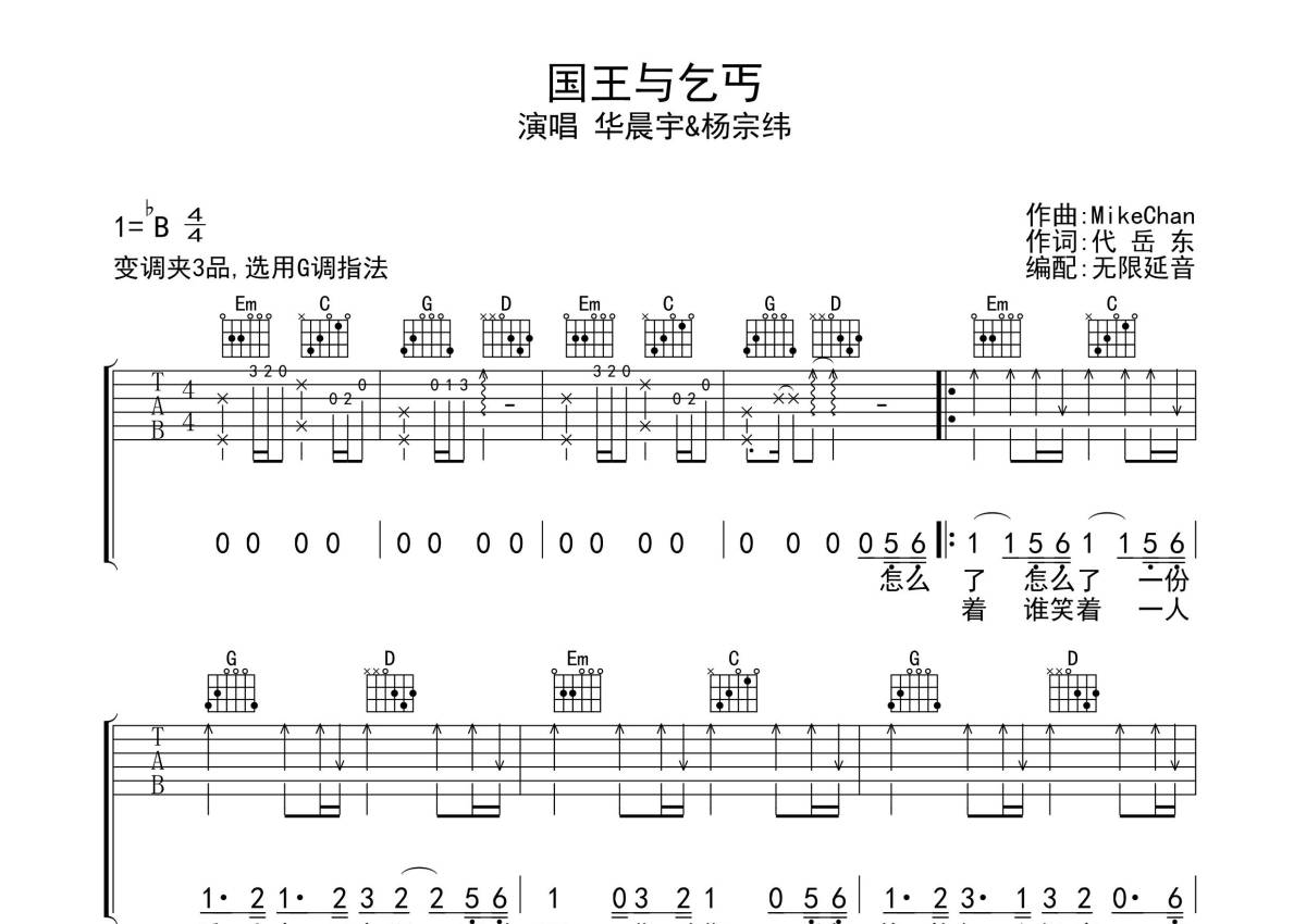 杨宗纬/华晨宇《国王与乞丐》吉他谱 - G调弹唱六线谱