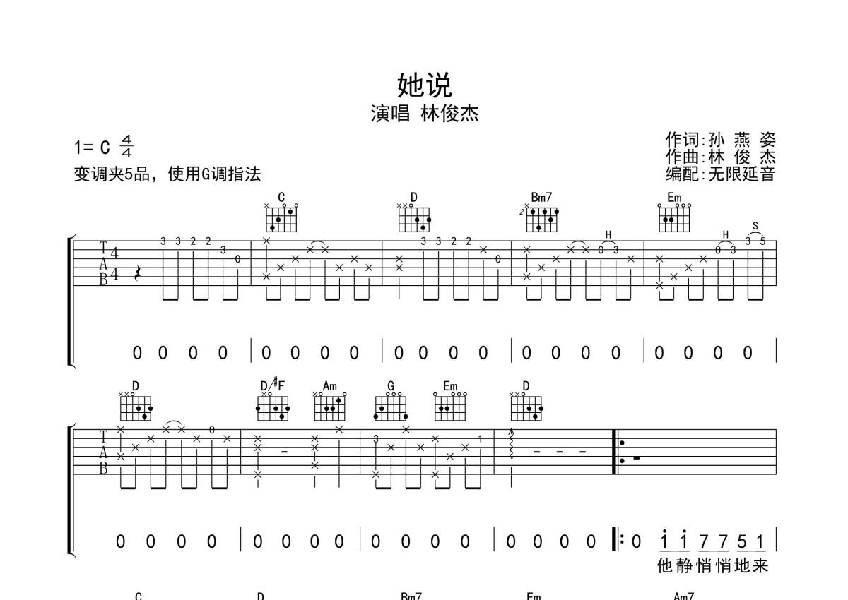 林俊杰《她说》吉他谱 - G调弹唱六线谱