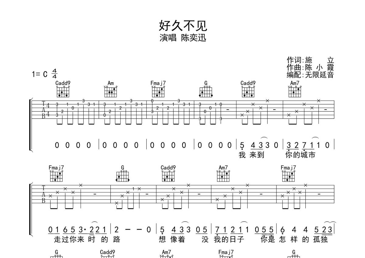 陈奕迅《好久不见》吉他谱 - C调弹唱六线谱