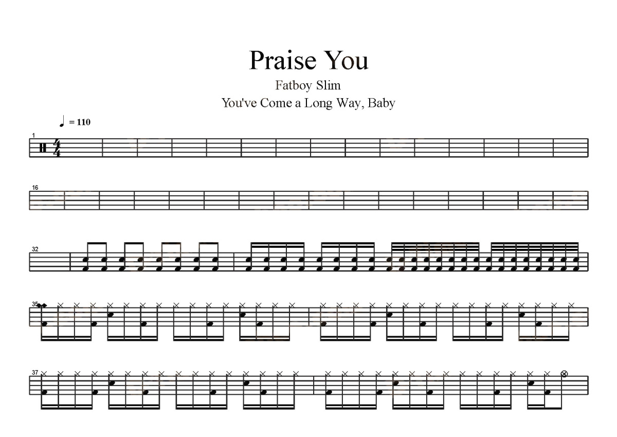 《Praise You》是Fatboy Slim演唱的一首歌曲,这份鼓谱共有三张高清图谱,图谱由 @打鼓谱 编配上传,图谱使用五线谱编配,使用这份Praise You架子鼓谱,你将能够轻松地敲打出这首Fatboy Slim的Praise You,快来尝试吧。首张收录专辑: You've Come a Long Way, Baby