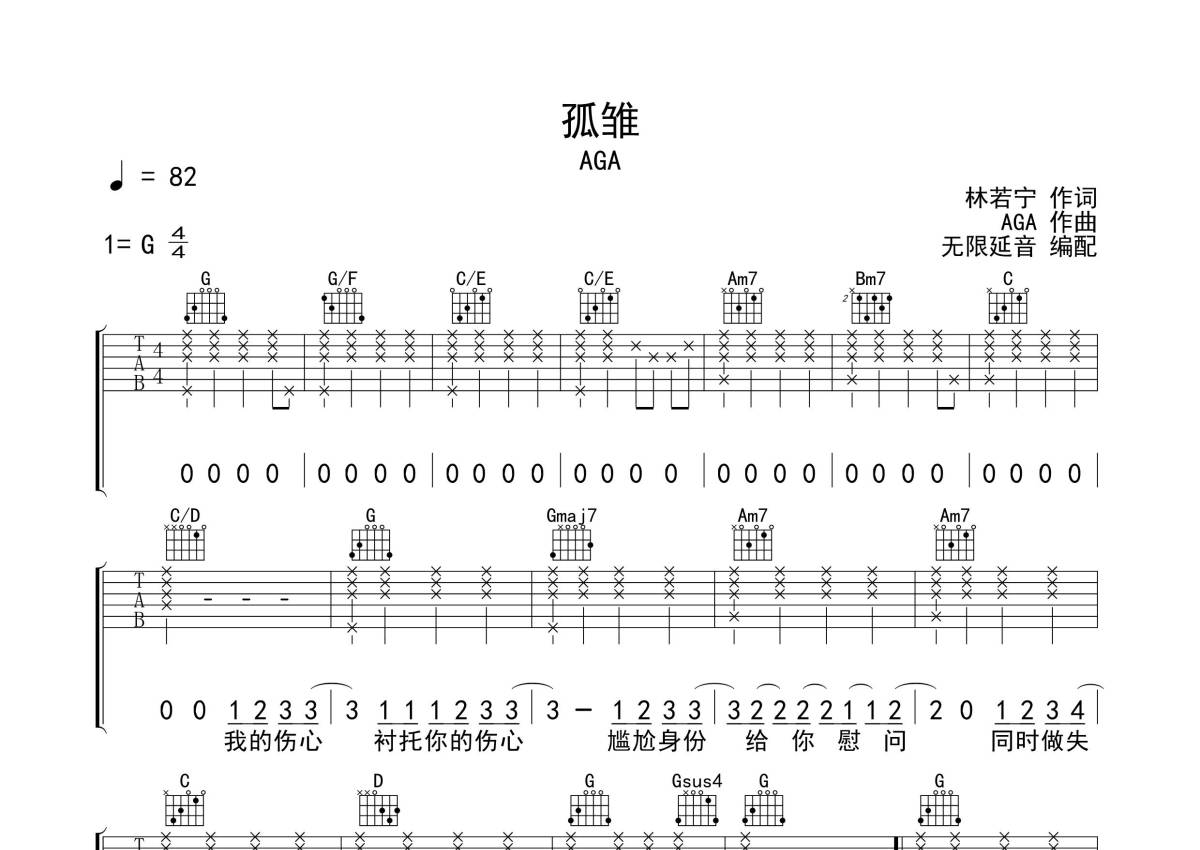 《孤雏》是AGA演唱的一首歌曲,拍号为4/4拍,歌曲速度为每分钟82拍,歌曲原调为G调,本吉他谱采用的是G调指法编配,演奏时不需要使用变调夹即为原调,这份吉他谱共有三张高清图谱,图谱由 @无限延音 编配上传,图谱使用六线谱编配,包含吉他和弦指法、简谱以及歌词部分,使用这份孤雏吉他谱,可以让你更加方便地掌握这首歌曲的弹唱技巧,快来尝试吧。