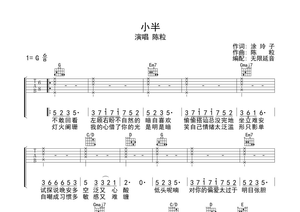 陈粒《小半》吉他谱 - G调弹唱六线谱