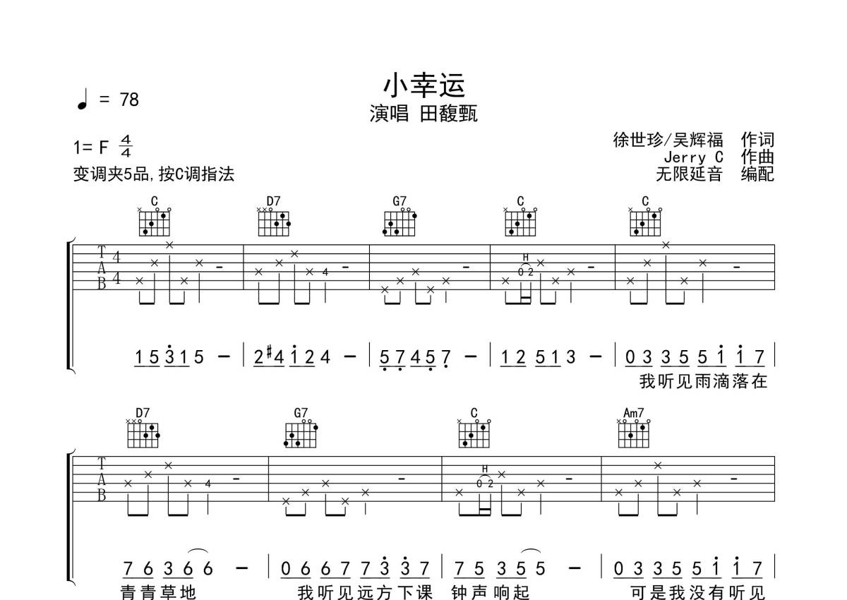 《小幸运》是田馥甄演唱的一首歌曲,拍号为4/4拍,歌曲速度为每分钟78拍,歌曲原调为F调,但由于原调指法比较难,为了方便弹奏,本吉他谱采用的是C调指法编配,变调夹5品弹奏即为原调,当然也可以根据自己的音域改变变调夹位置,或者通过改变和弦调性,以方便自己弹奏,这份吉他谱共有三张高清图谱,图谱由 @无限延音 编配上传,图谱使用六线谱编配,包含吉他和弦指法、简谱以及歌词部分,使用这份小幸运吉他谱,可以让你更加方便地掌握这首歌曲的弹唱技巧,快来尝试吧。