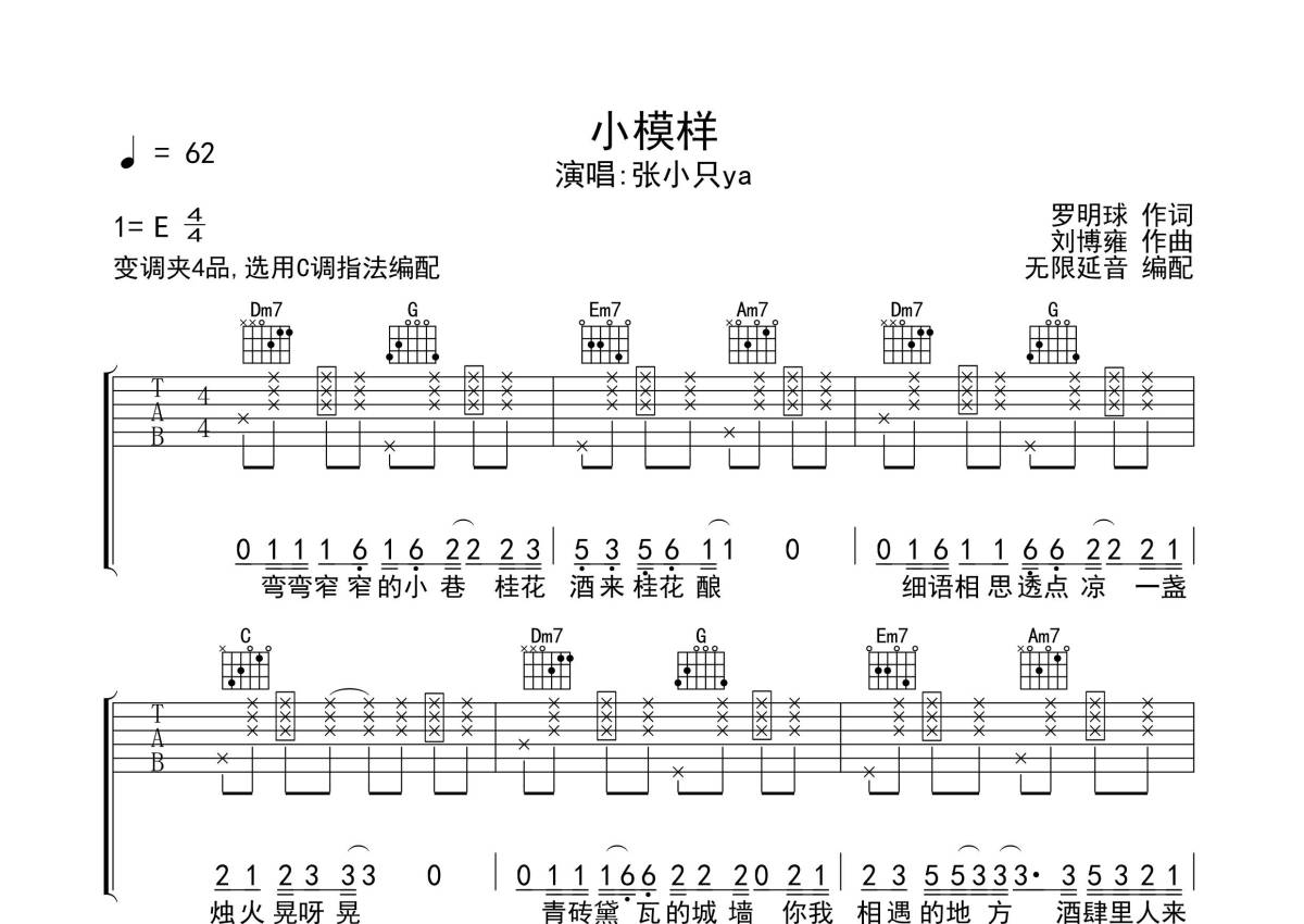 《小模样》是张小只ya演唱的一首歌曲,拍号为4/4拍,歌曲速度为每分钟62拍,歌曲原调为E调,但由于原调指法比较难,为了方便弹奏,本吉他谱采用的是C调指法编配,变调夹4品弹奏即为原调,当然也可以根据自己的音域改变变调夹位置,或者通过改变和弦调性,以方便自己弹奏,这份吉他谱共有三张高清图谱,图谱由 @无限延音 编配上传,图谱使用六线谱编配,包含吉他和弦指法、简谱以及歌词部分,使用这份小模样吉他谱,可以让你更加方便地掌握这首歌曲的弹唱技巧,快来尝试吧。