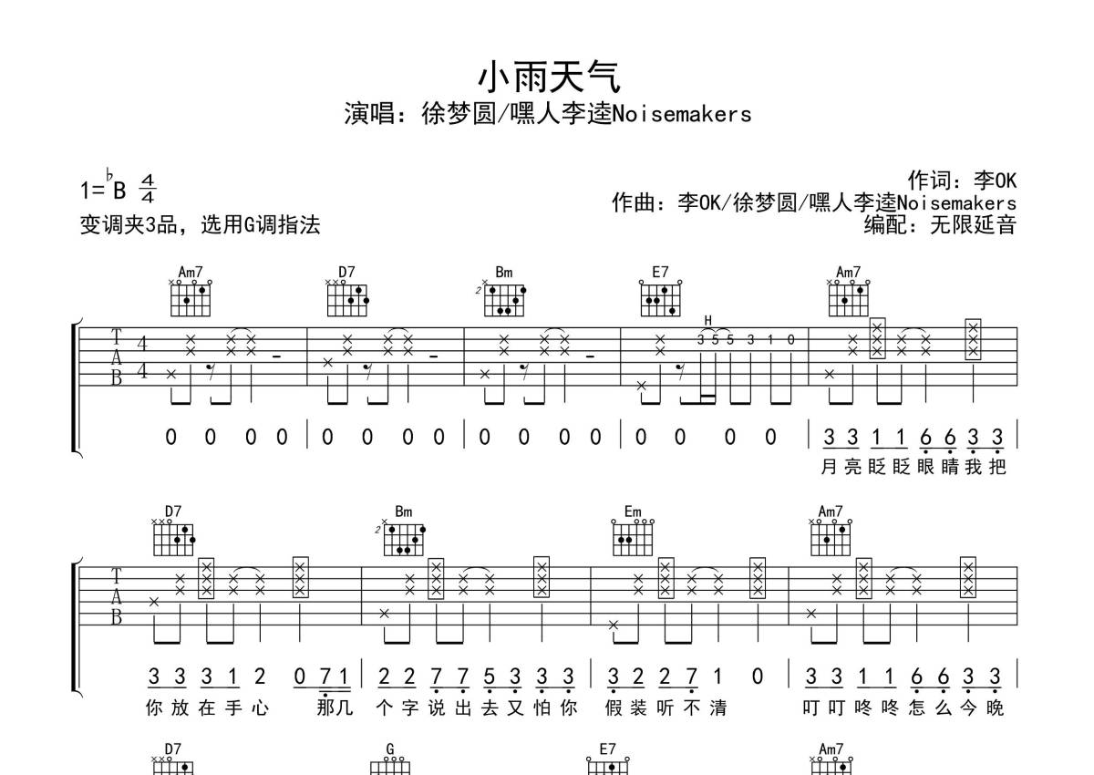 徐梦圆/嘿人李逵Noisemakers《小雨天气》吉他谱 - G调弹唱六线谱