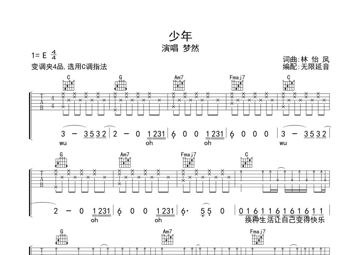 《少年》是梦然演唱的一首歌曲,拍号为4/4拍,歌曲原调为E调,但由于原调指法比较难,为了方便弹奏,本吉他谱采用的是C调指法编配,变调夹4品弹奏即为原调,当然也可以根据自己的音域改变变调夹位置,或者通过改变和弦调性,以方便自己弹奏,这份吉他谱共有四张高清图谱,图谱由 @无限延音 编配上传,图谱使用六线谱编配,包含吉他和弦指法、简谱以及歌词部分,使用这份少年吉他谱,可以让你更加方便地掌握这首歌曲的弹唱技巧,快来尝试吧。