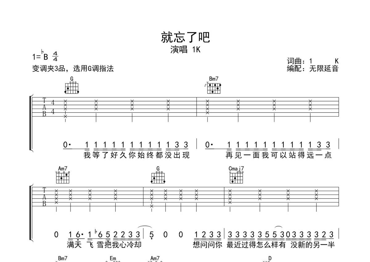 1K《就忘了吧》吉他谱 - G调弹唱六线谱