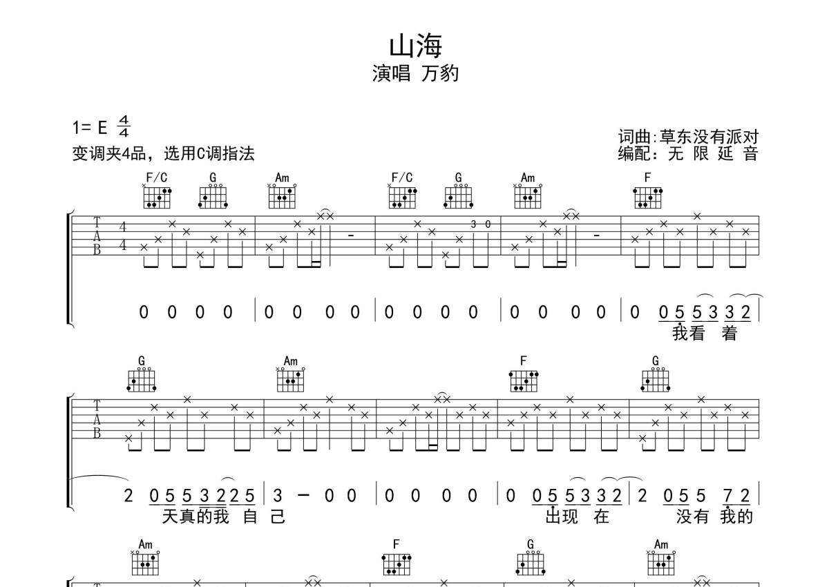 《山海》是草东没有派对演唱的一首歌曲,拍号为4/4拍,歌曲原调为E调,但由于原调指法比较难,为了方便弹奏,本吉他谱采用的是C调指法编配,变调夹4品弹奏即为原调,当然也可以根据自己的音域改变变调夹位置,或者通过改变和弦调性,以方便自己弹奏,这份吉他谱共有三张高清图谱,图谱由 @无限延音 编配上传,图谱使用六线谱编配,包含吉他和弦指法、简谱以及歌词部分,使用这份山海吉他谱,可以让你更加方便地掌握这首歌曲的弹唱技巧,快来尝试吧。