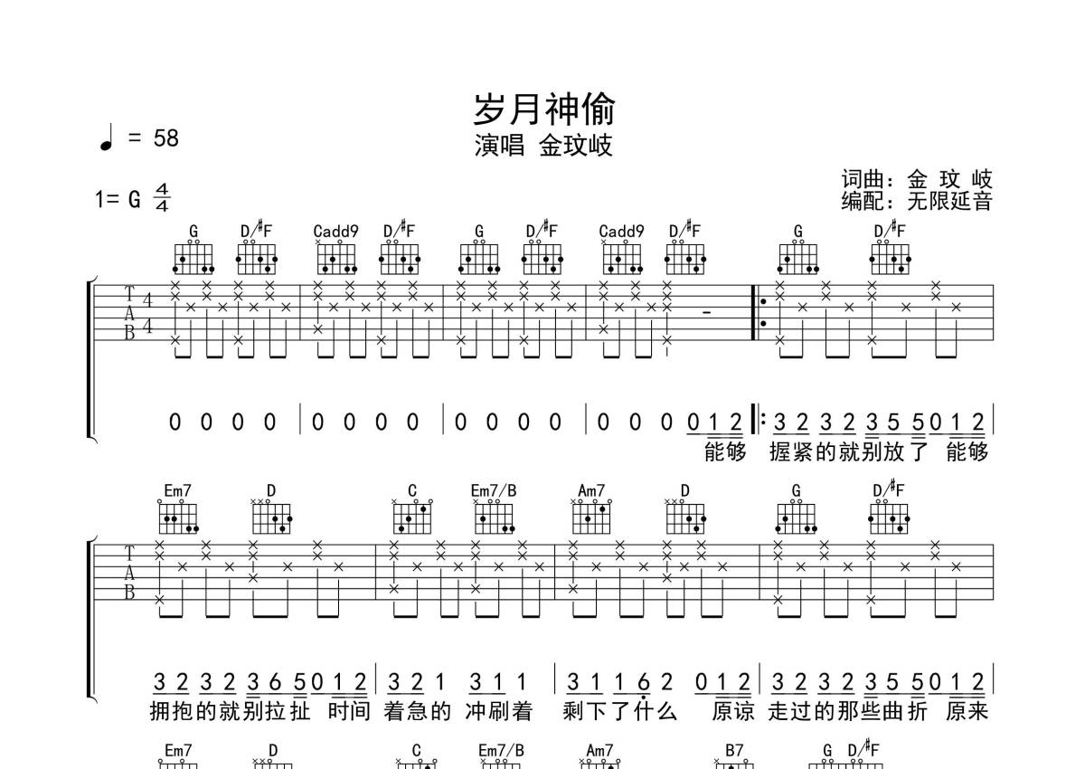 金玟岐《岁月神偷》吉他谱 - G调弹唱六线谱