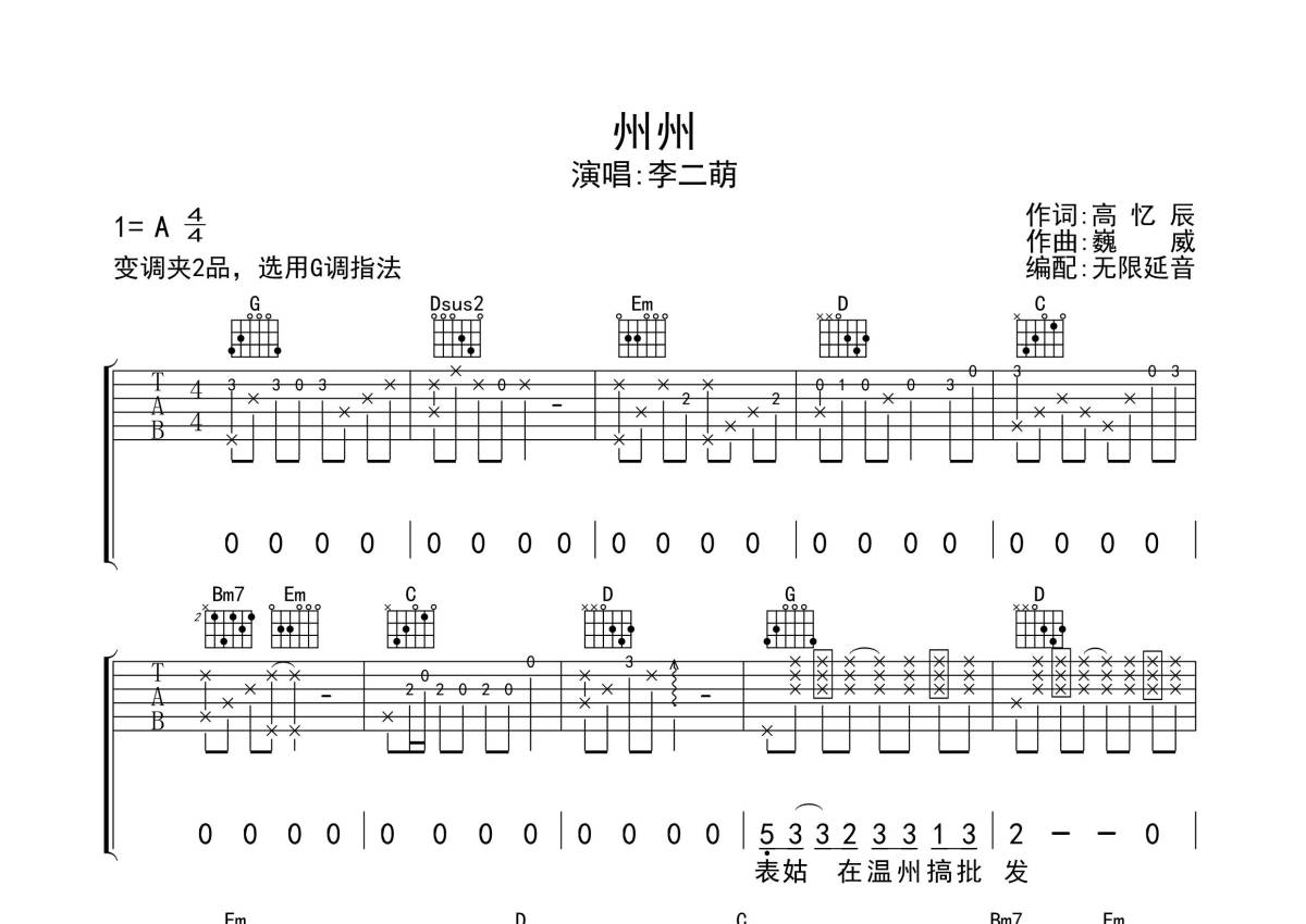 李二萌《州州》吉他谱 - G调弹唱六线谱