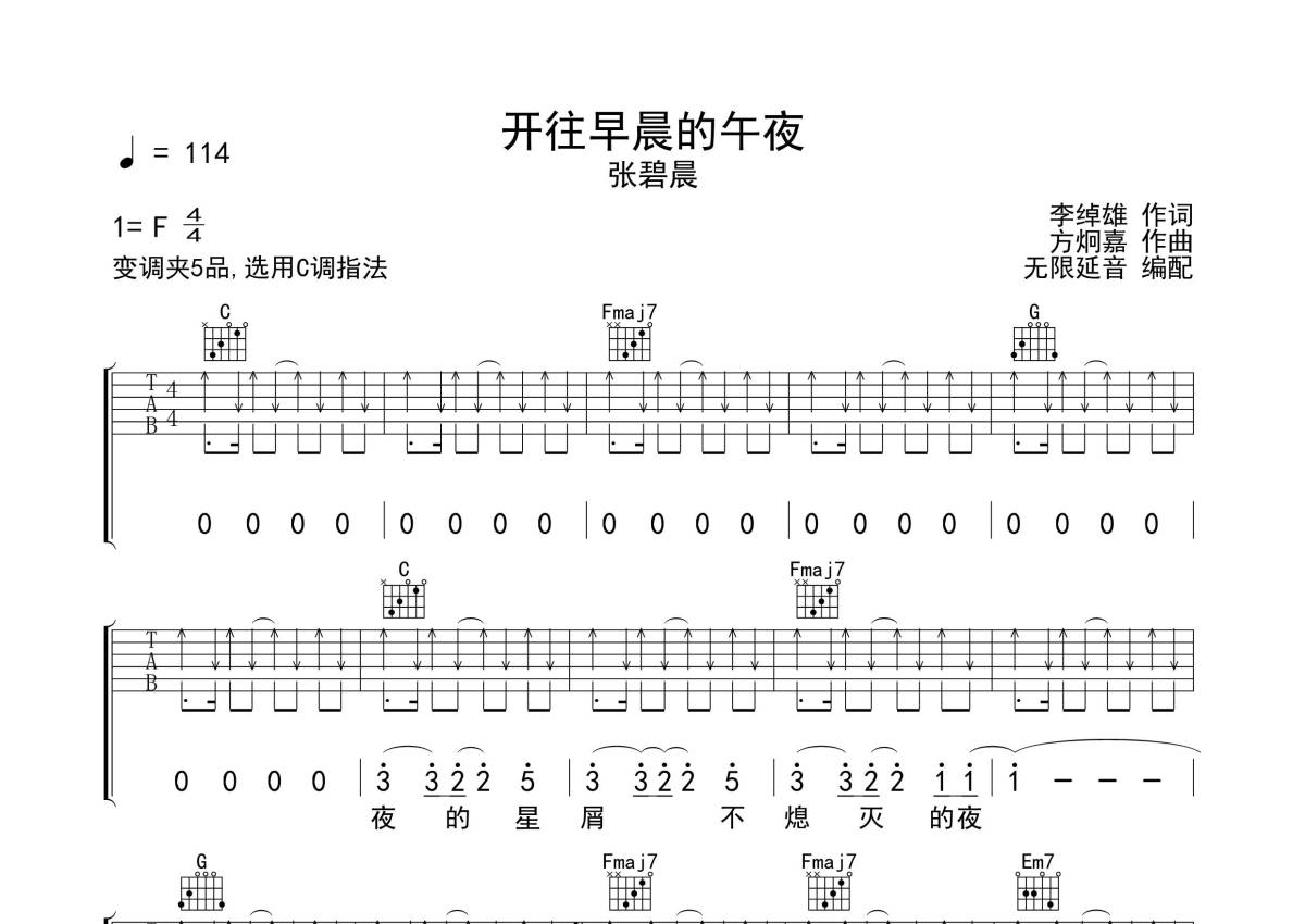 《开往早晨的午夜》是张碧晨演唱的一首歌曲,拍号为4/4拍,歌曲速度为每分钟114拍,歌曲原调为F调,但由于原调指法比较难,为了方便弹奏,本吉他谱采用的是C调指法编配,变调夹5品弹奏即为原调,当然也可以根据自己的音域改变变调夹位置,或者通过改变和弦调性,以方便自己弹奏,这份吉他谱共有四张高清图谱,图谱由 @无限延音 编配上传,图谱使用六线谱编配,包含吉他和弦指法、简谱以及歌词部分,使用这份开往早晨的午夜吉他谱,可以让你更加方便地掌握这首歌曲的弹唱技巧,快来尝试吧。
