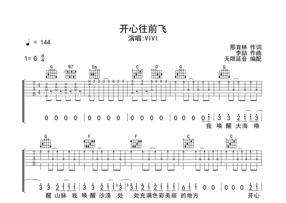 《开心往前飞》是VIVI演唱的一首歌曲,拍号为4/4拍,歌曲速度为每分钟144拍,歌曲原调为C调,本吉他谱采用的是C调指法编配,演奏时不需要使用变调夹即为原调,这份吉他谱共有两张高清图谱,图谱由 @无限延音 编配上传,图谱使用六线谱编配,包含吉他和弦指法、简谱以及歌词部分,使用这份开心往前飞吉他谱,可以让你更加方便地掌握这首歌曲的弹唱技巧,快来尝试吧。