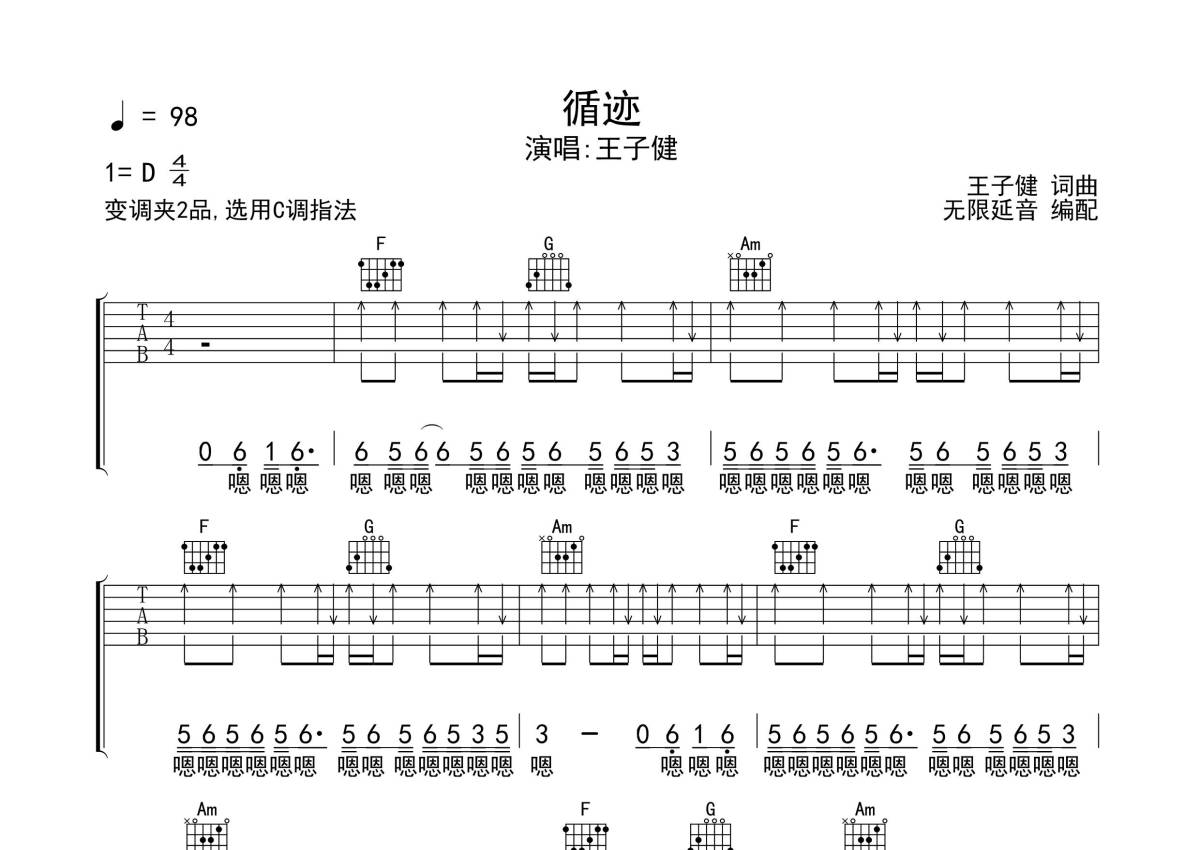 《循迹》是王子健演唱的一首歌曲,拍号为4/4拍,歌曲速度为每分钟98拍,歌曲原调为D调,但由于原调指法比较难,为了方便弹奏,本吉他谱采用的是C调指法编配,变调夹2品弹奏即为原调,当然也可以根据自己的音域改变变调夹位置,或者通过改变和弦调性,以方便自己弹奏,这份吉他谱共有四张高清图谱,图谱由 @无限延音 编配上传,图谱使用六线谱编配,包含吉他和弦指法、简谱以及歌词部分,使用这份循迹吉他谱,可以让你更加方便地掌握这首歌曲的弹唱技巧,快来尝试吧。