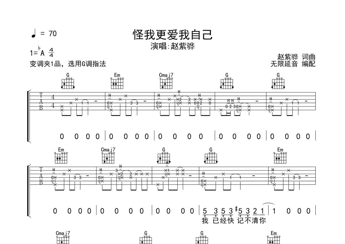 《怪我更爱我自己》是赵紫骅演唱的一首歌曲,拍号为4/4拍,歌曲速度为每分钟70拍,歌曲原调为Ab调,但由于原调指法比较难,为了方便弹奏,本吉他谱采用的是G调指法编配,变调夹1品弹奏即为原调,当然也可以根据自己的音域改变变调夹位置,或者通过改变和弦调性,以方便自己弹奏,这份吉他谱共有四张高清图谱,图谱由 @无限延音 编配上传,图谱使用六线谱编配,包含吉他和弦指法、简谱以及歌词部分,使用这份怪我更爱我自己吉他谱,可以让你更加方便地掌握这首歌曲的弹唱技巧,快来尝试吧。