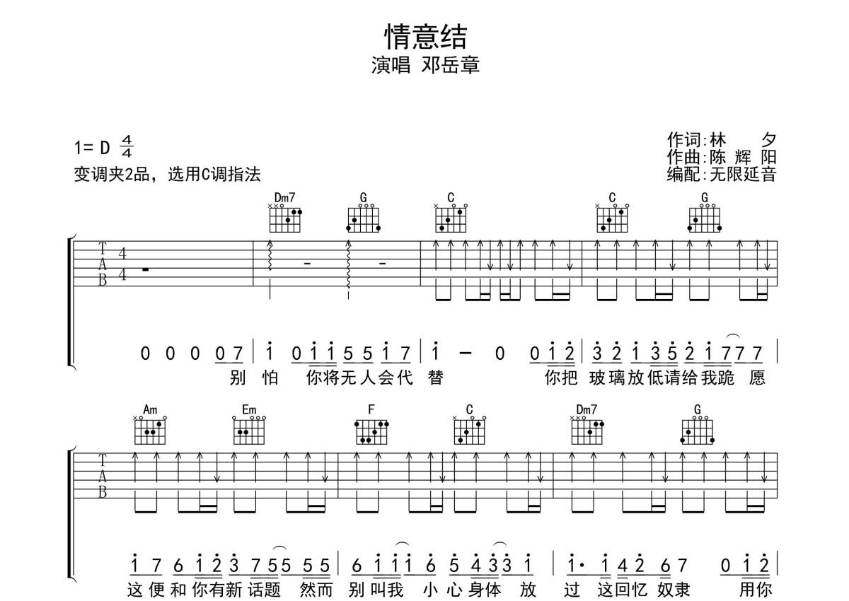《情意结》是邓岳章演唱的一首歌曲,拍号为4/4拍,歌曲原调为D调,但由于原调指法比较难,为了方便弹奏,本吉他谱采用的是C调指法编配,变调夹2品弹奏即为原调,当然也可以根据自己的音域改变变调夹位置,或者通过改变和弦调性,以方便自己弹奏,这份吉他谱共有四张高清图谱,图谱由 @无限延音 编配上传,图谱使用六线谱编配,包含吉他和弦指法、简谱以及歌词部分,使用这份情意结吉他谱,可以让你更加方便地掌握这首歌曲的弹唱技巧,快来尝试吧。