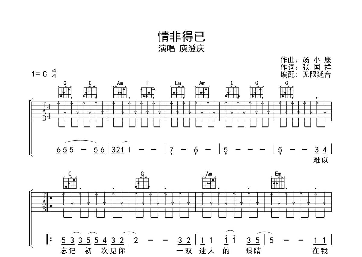 《情非得已》是庾澄庆演唱的一首歌曲,拍号为4/4拍,歌曲原调为C调,本吉他谱采用的是C调指法编配,演奏时不需要使用变调夹即为原调,这份吉他谱共有三张高清图谱,图谱由 @无限延音 编配上传,图谱使用六线谱编配,包含吉他和弦指法、简谱以及歌词部分,使用这份情非得已吉他谱,可以让你更加方便地掌握这首歌曲的弹唱技巧,快来尝试吧。