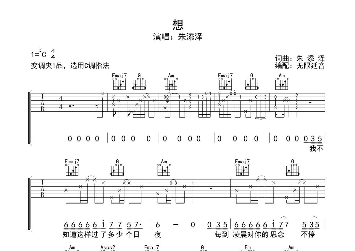 朱添泽《想》吉他谱 - C调弹唱六线谱