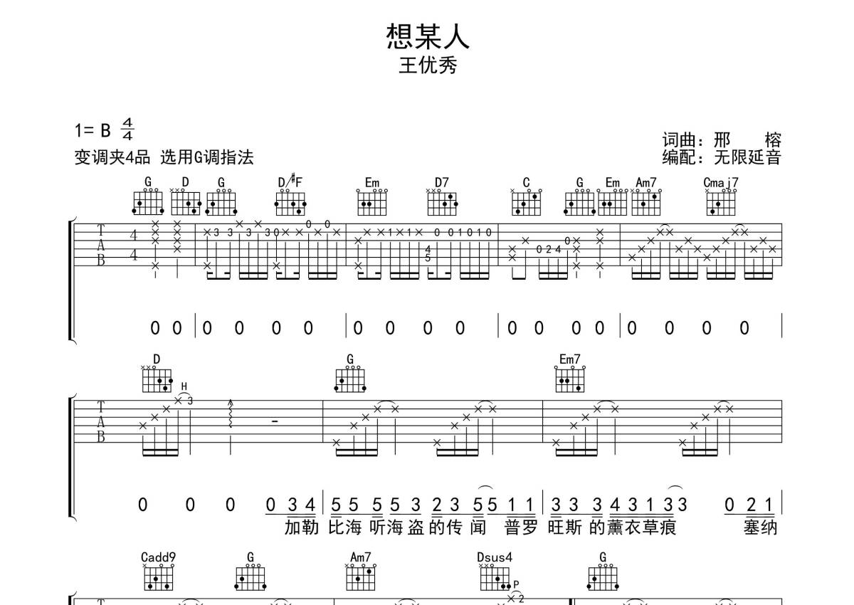 《想某人》是王优秀演唱的一首歌曲,拍号为4/4拍,歌曲原调为B调,但由于原调指法比较难,为了方便弹奏,本吉他谱采用的是G调指法编配,变调夹4品弹奏即为原调,当然也可以根据自己的音域改变变调夹位置,或者通过改变和弦调性,以方便自己弹奏,这份吉他谱共有两张高清图谱,图谱由 @无限延音 编配上传,图谱使用六线谱编配,包含吉他和弦指法、简谱以及歌词部分,使用这份想某人吉他谱,可以让你更加方便地掌握这首歌曲的弹唱技巧,快来尝试吧。
