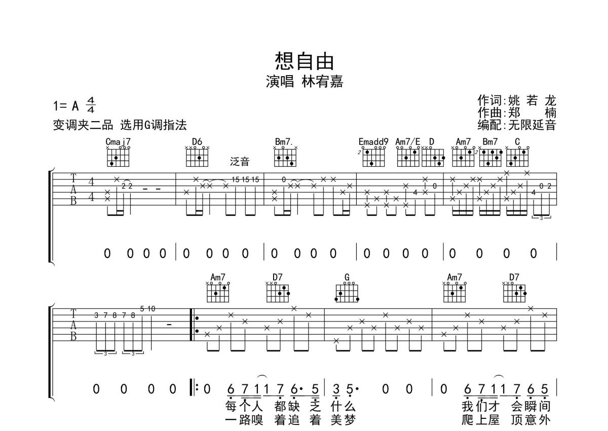 林宥嘉《想自由》吉他谱 - G调弹唱六线谱