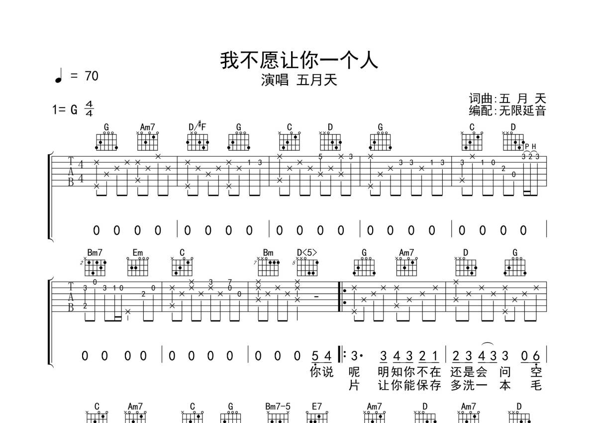 《我不愿让你一个人》是五月天演唱的一首歌曲,拍号为4/4拍,歌曲速度为每分钟70拍,歌曲原调为G调,本吉他谱采用的是G调指法编配,演奏时不需要使用变调夹即为原调,这份吉他谱共有三张高清图谱,图谱由 @无限延音 编配上传,图谱使用六线谱编配,包含吉他和弦指法、简谱以及歌词部分,使用这份我不愿让你一个人吉他谱,可以让你更加方便地掌握这首歌曲的弹唱技巧,快来尝试吧。