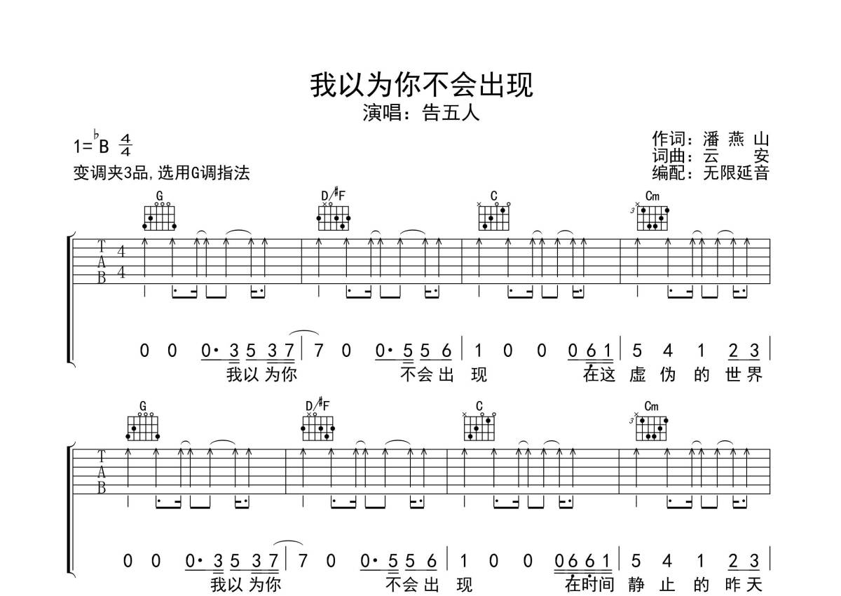 《我以为你不会出现》是告五人演唱的一首歌曲,拍号为4/4拍,歌曲原调为Bb调,但由于原调指法比较难,为了方便弹奏,本吉他谱采用的是G调指法编配,变调夹3品弹奏即为原调,当然也可以根据自己的音域改变变调夹位置,或者通过改变和弦调性,以方便自己弹奏,这份吉他谱共有四张高清图谱,图谱由 @无限延音 编配上传,图谱使用六线谱编配,包含吉他和弦指法、简谱以及歌词部分,使用这份我以为你不会出现吉他谱,可以让你更加方便地掌握这首歌曲的弹唱技巧,快来尝试吧。