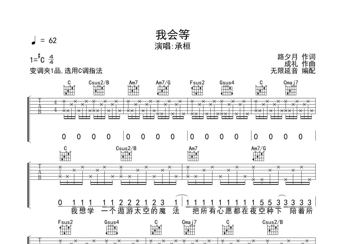 《我会等》是承桓演唱的一首歌曲,拍号为4/4拍,歌曲速度为每分钟62拍,歌曲原调为Db调,但由于原调指法比较难,为了方便弹奏,本吉他谱采用的是C调指法编配,变调夹1品弹奏即为原调,当然也可以根据自己的音域改变变调夹位置,或者通过改变和弦调性,以方便自己弹奏,这份吉他谱共有三张高清图谱,图谱由 @无限延音 编配上传,图谱使用六线谱编配,包含吉他和弦指法、简谱以及歌词部分,使用这份我会等吉他谱,可以让你更加方便地掌握这首歌曲的弹唱技巧,快来尝试吧。