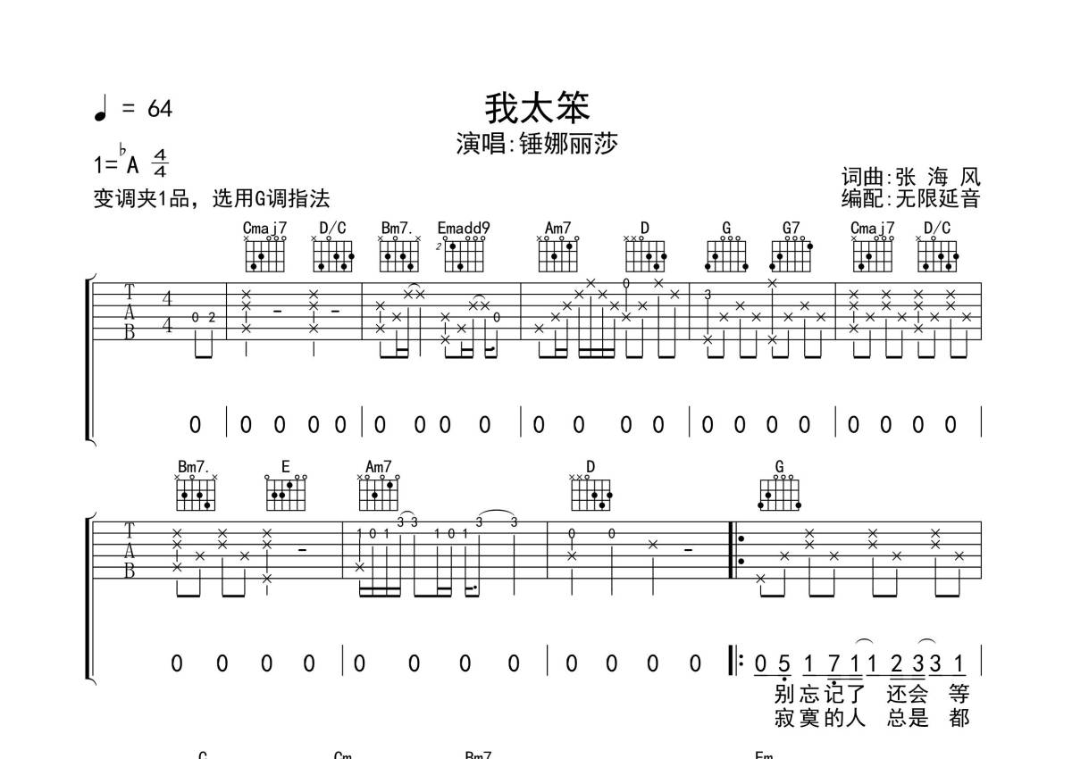 《我太笨》是锤娜丽莎演唱的一首歌曲,拍号为4/4拍,歌曲速度为每分钟64拍,歌曲原调为Ab调,但由于原调指法比较难,为了方便弹奏,本吉他谱采用的是G调指法编配,变调夹1品弹奏即为原调,当然也可以根据自己的音域改变变调夹位置,或者通过改变和弦调性,以方便自己弹奏,这份吉他谱共有三张高清图谱,图谱由 @无限延音 编配上传,图谱使用六线谱编配,包含吉他和弦指法、简谱以及歌词部分,使用这份我太笨吉他谱,可以让你更加方便地掌握这首歌曲的弹唱技巧,快来尝试吧。