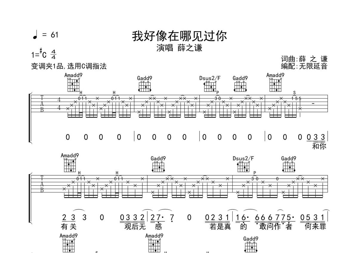薛之谦《我好像在哪见过你》吉他谱 - C调弹唱六线谱