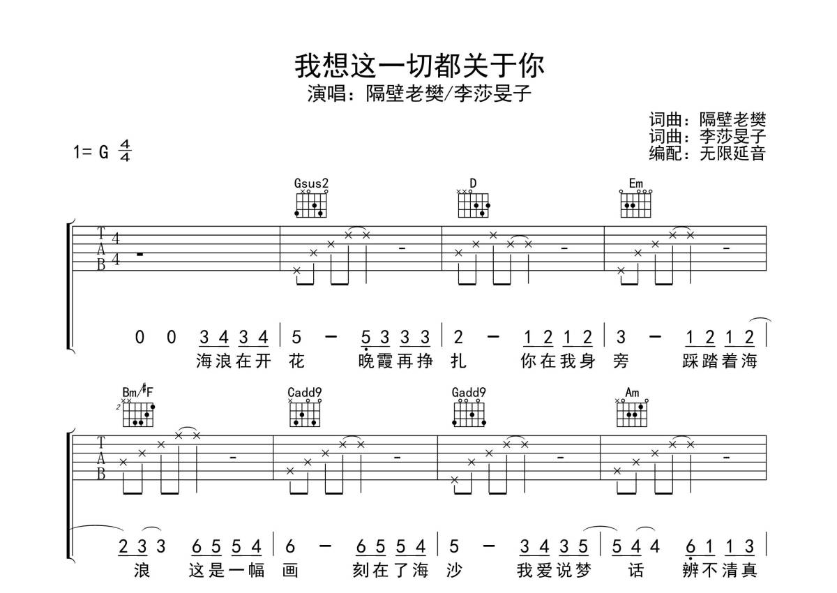 隔壁老樊/李莎雯子《我想这一切都关于你》吉他谱 - G调弹唱六线谱