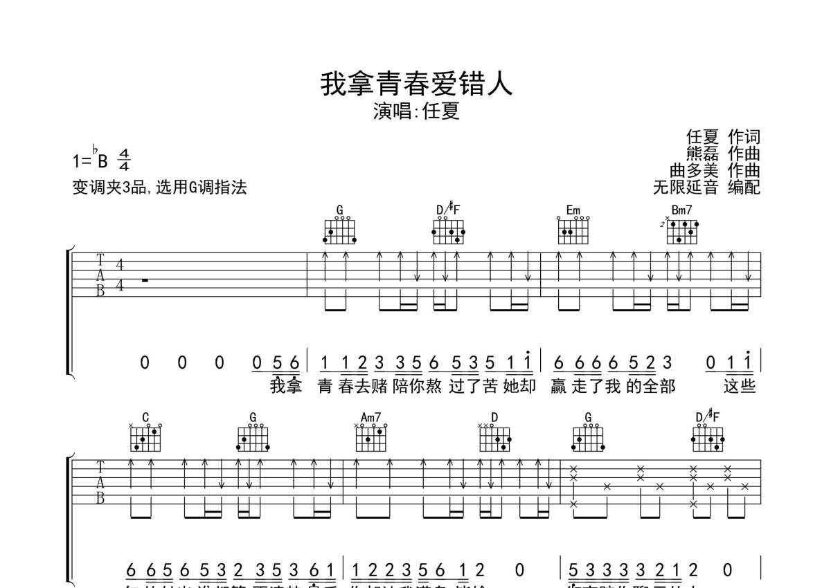 《我拿青春爱错人》是任夏演唱的一首歌曲,拍号为4/4拍,歌曲原调为Bb调,但由于原调指法比较难,为了方便弹奏,本吉他谱采用的是G调指法编配,变调夹3品弹奏即为原调,当然也可以根据自己的音域改变变调夹位置,或者通过改变和弦调性,以方便自己弹奏,这份吉他谱共有三张高清图谱,图谱由 @无限延音 编配上传,图谱使用六线谱编配,包含吉他和弦指法、简谱以及歌词部分,使用这份我拿青春爱错人吉他谱,可以让你更加方便地掌握这首歌曲的弹唱技巧,快来尝试吧。