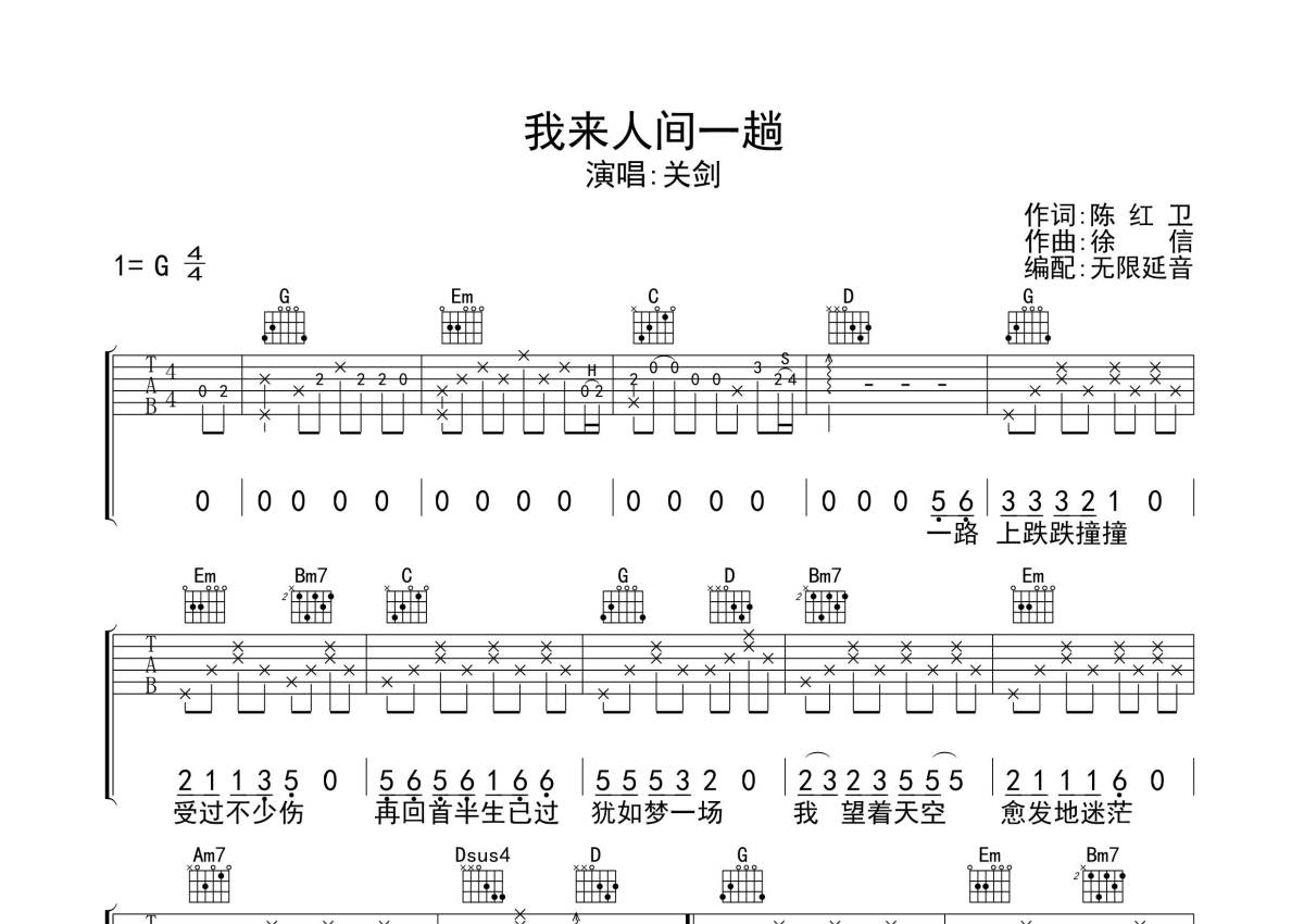 关剑《我来人间一趟》吉他谱 - G调弹唱六线谱